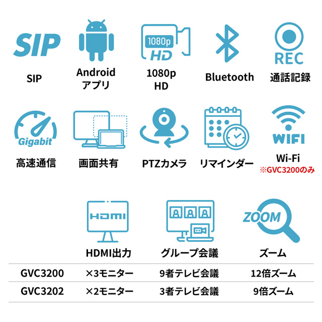 - 内蔵MCU 最大1080p 4拠点・VGA9拠点(GVC3200)/ 最大1080p 2拠点・VGA3拠点(GVC3202)によるテレビ会議